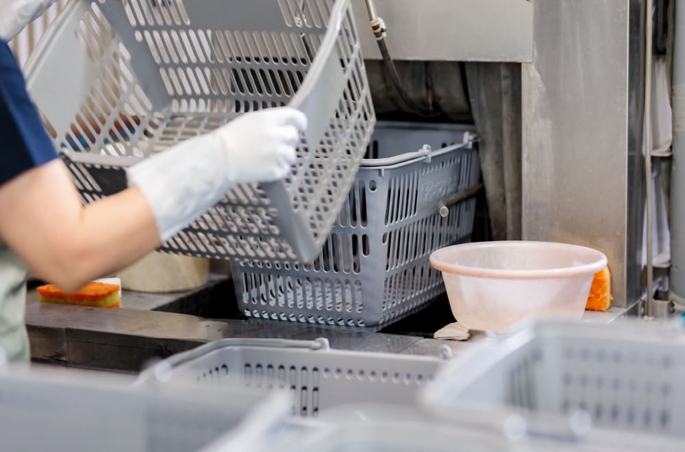 カゴを洗浄する、その単純にも思える作業には、お客様に安心して使ってほしいという想いが込められています。